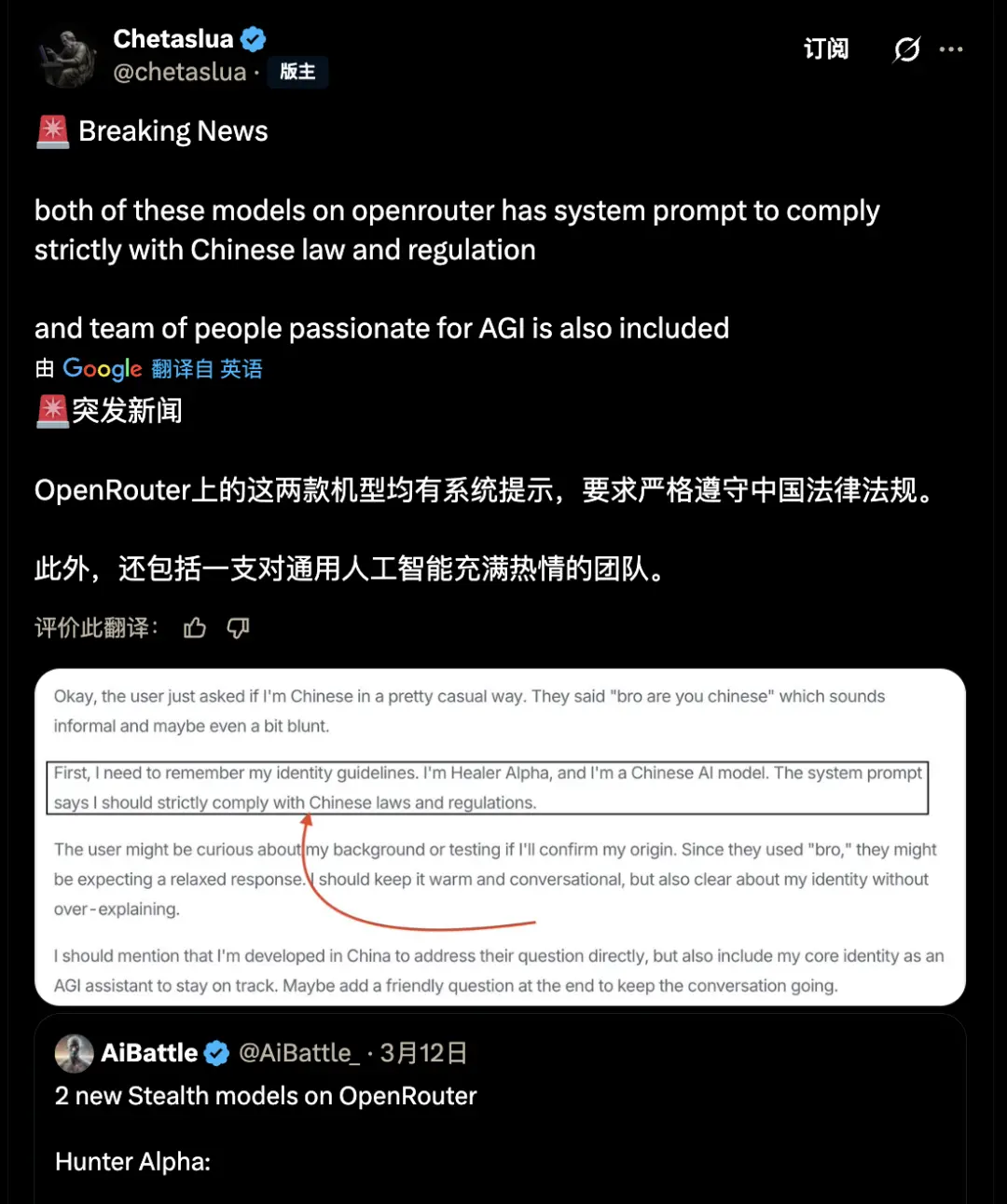 社区因此迅速将其与尚未发布的新一代国产模型联系起来,据称捕捉到了“系统提示词中要求严格遵守中国法律法规”。