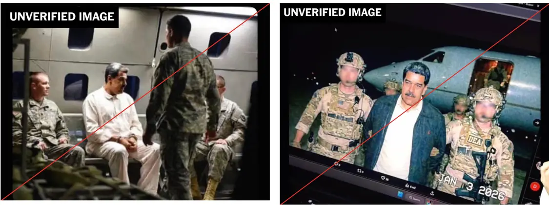 其实,就在特朗普发布这张照片之前,社交媒体上已经开始流传另外一张关于马杜罗被捕的图片。那张图片似乎显示马杜罗被美军或美国缉毒局官员拘留。该图片未经核实,是由一位《纽约时报》记者的消息源提供的。《纽约时报》摄影部的新闻总监克林顿·卡吉尔(Clinton Cargil)在社交媒体上发现了这张图片,以及另一张相关图片。