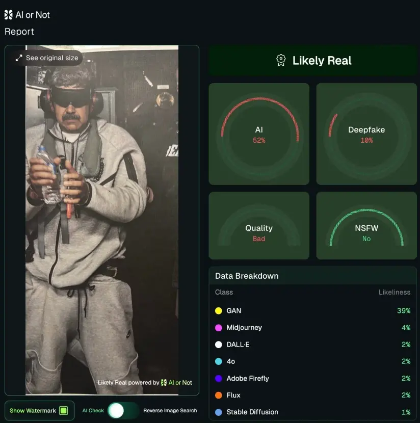 这张照片看起来有些蹊跷:它被裁剪成了罕见的竖版模式,似乎原始图像的大部分内容已被裁切,且画质低劣。《纽约时报》的一位图片编辑指出,这看起来像是打印照片的翻拍图,或者是对屏幕进行拍摄的照片。当使用AI检测工具进行分析时,特朗普发布的这张照片也存在一定的不确定性。