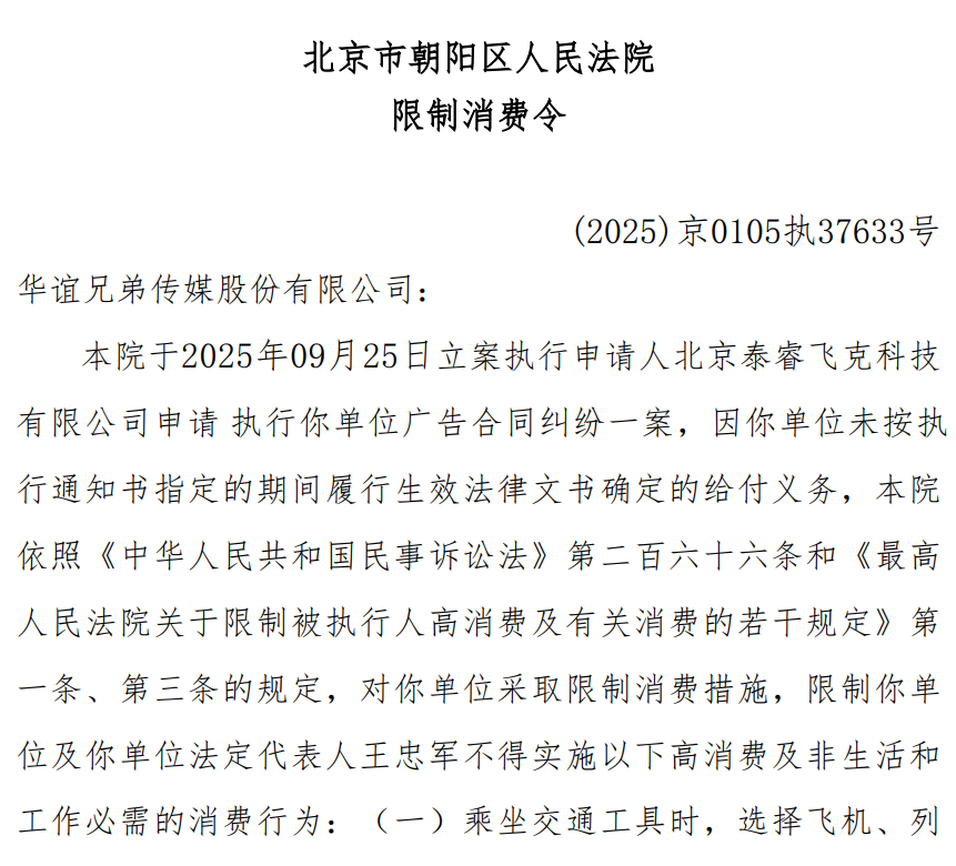 天眼查显示,近日,华谊兄弟传媒股份有限公司(华谊兄弟,300027.SZ)及其法定代表人王忠军(王中军)新增一则限制消费令,涉及广告合同纠纷案件,申请人为北京泰睿飞克科技有限公司,执行法院为北京市朝阳区人民法院。