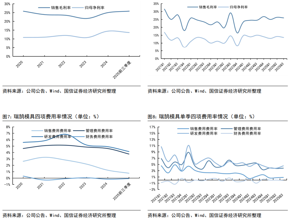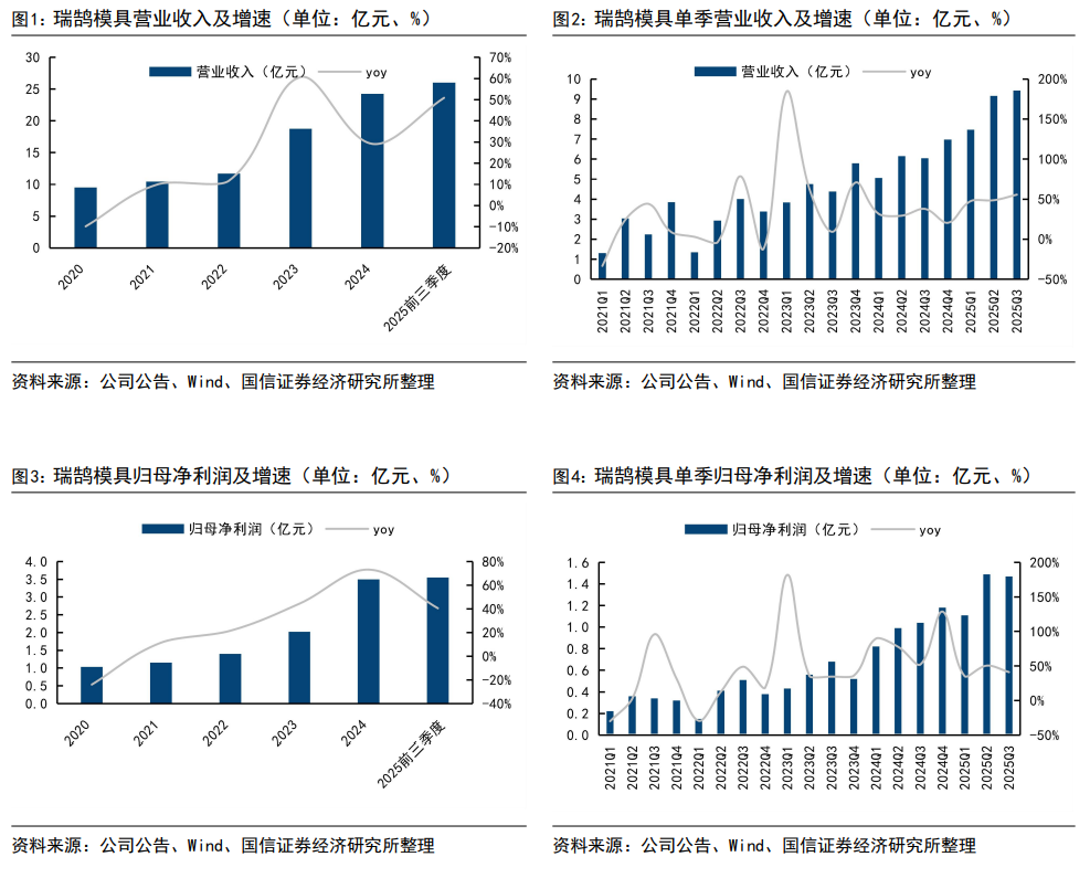 公司2025Q3收入同比增长56%。瑞鹄模具2025Q3实现营收9.42亿元,同比+55.7%;实现归母净利润1.28亿元,同比+41%。受益于客户销量高增及新业务量产,公司营收增速超越行业44.7pct。自主品牌持续发力,以旧换新、车企促销等因素助力,2025Q3中国汽车产量达到849万辆,同比增长10.98%。公司营收增速超越行业45pct,核心原因在于下游客户销量快速增长及新业务放量。根据官网数据,奇瑞集团2025Q3销量同比增长15%至75万辆。同时公司汽车制造装备业务积极深化国际主流品牌区域化市场开拓、一带一路国家属地品牌客户开拓,并积极陪同国内头部品牌深化海外本地化开发。