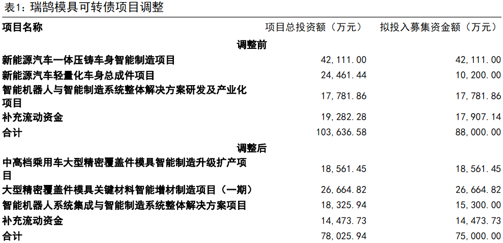 可转债募投项目调整,投建中高档乘用车大型精密覆盖件模具智能制造升级扩产项目;大型精密覆盖件模具关键材料智能增材制造项目(一期);智能机器人系统集成与智能制造系统整体解决方案项目。其中“智能机器人系统集成与智能制造系统整体解决方案项目”为考虑智能制造快速普及,工厂内部制造复杂度持续攀升,对移动复合机器人及自动牵引机器人(AGV/AMR)需求明显加快。“大型精密覆盖件模具关键材料智能增材制造项目(一期)"则为考虑公司模具业务规模持续扩大,客户对模具产品订货周期要求越来越短需求投建。