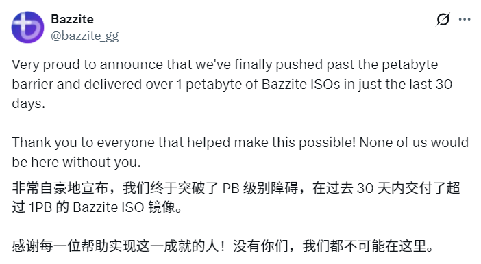 Bazzite的开发团队在社交媒体上宣布,从10月29日到11月28日的一个月内,该网站首次实现了超过1PB的ISO文件传输,在短短30天内,网站独立访问用户达到73万。
