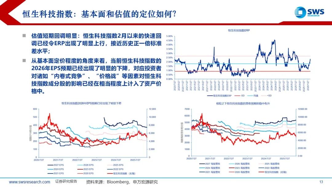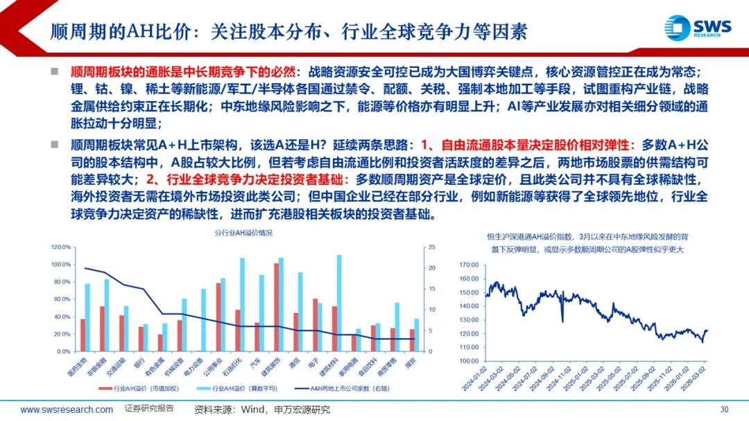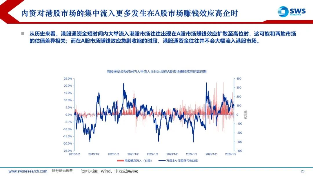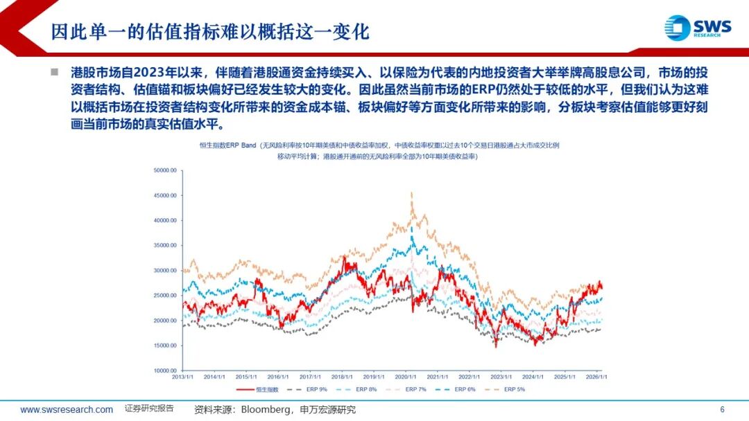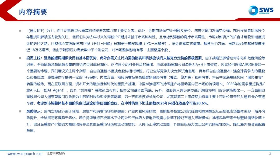 投资主线:强势的顺周期板块具有基本面优势,此外亦需关注泛内需的消费和科技板块尚未被充分定价的积极因素。由于战略资源管控常态化和地缘风险等因素,全球能源及新能源金属的供给约束可能长期化,正持续拉动相关板块的通胀。而此类顺周期公司多数为A+H上市架构,因此如何选择A股和H股是一个重要的命题。我们建议关注两个指标:自由流通股本量决定股价相对弹性,行业全球竞争力决定投资者基础,具有低自由流通股本+强全球竞争力的港股公司是优选,股息率亦可提供一定的下行保护。内需方面,港股消费板块高度聚焦服务消费(餐饮、旅游等)和新消费,符合中国消费结构向“服务主导”转型的趋势。而在互联网方面,资本开支的增加是新时代的重资产基建,中国AI渗透率的持续提升将驱动国内云市场的持续增长。2026年的竞争重点将是C端AI入口(如AI Agent),此外“反内卷”等政策也有利于相关公司基本面筑底。另外,港股通入通交易亦是近期较为热门的交易策略之一,一方面新的高股息公司入通有望吸引以险资为主的绝对收益型投资者配置,另一方面科技成长类公司,尤其是第二上市转换为双重主要上市地位带来的入通机会亦有迹可循。考虑到市场整体基本面的筑底以及流动性层面的宽松,在中性情景下恒生指数2026年内潜在收益率可达20.6%。