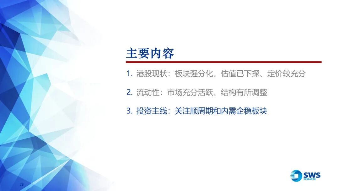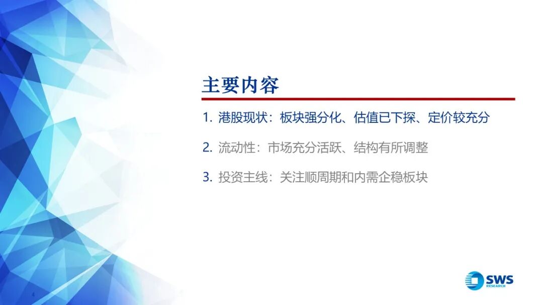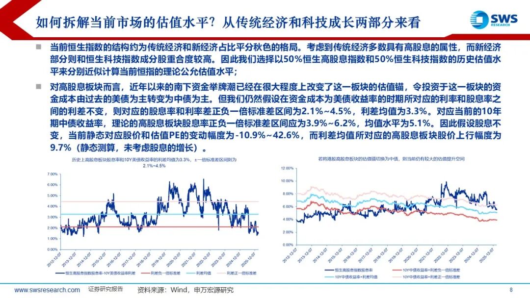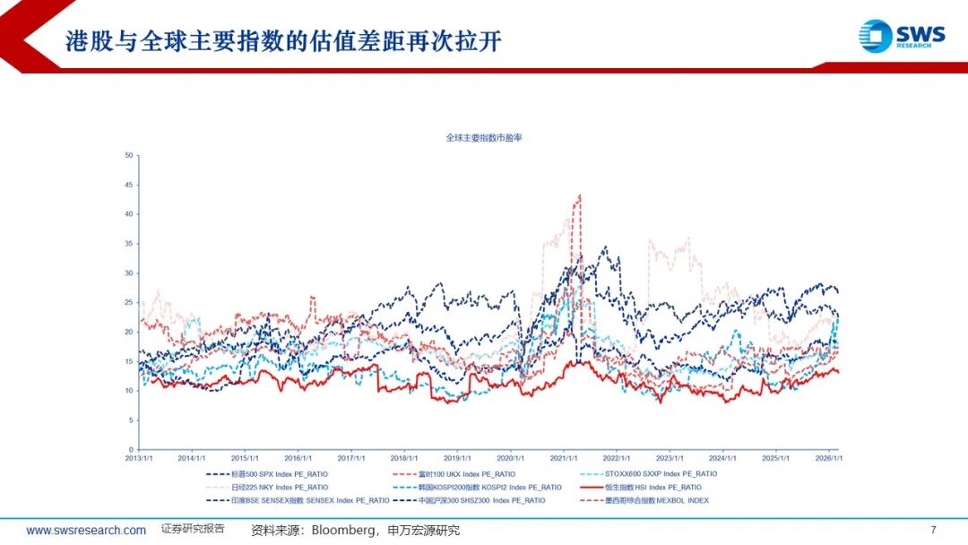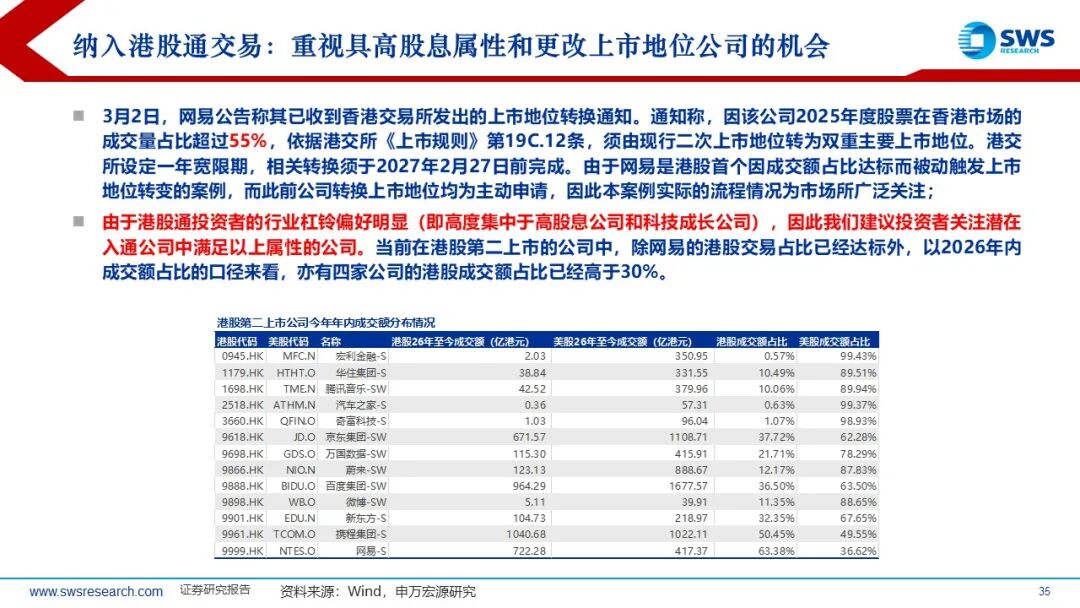 投资主线:强势的顺周期板块具有基本面优势,此外亦需关注泛内需的消费和科技板块尚未被充分定价的积极因素。由于战略资源管控常态化和地缘风险等因素,全球能源及新能源金属的供给约束可能长期化,正持续拉动相关板块的通胀。而此类顺周期公司多数为A+H上市架构,因此如何选择A股和H股是一个重要的命题。我们建议关注两个指标:自由流通股本量决定股价相对弹性,行业全球竞争力决定投资者基础,具有低自由流通股本+强全球竞争力的港股公司是优选,股息率亦可提供一定的下行保护。内需方面,港股消费板块高度聚焦服务消费(餐饮、旅游等)和新消费,符合中国消费结构向“服务主导”转型的趋势。而在互联网方面,资本开支的增加是新时代的重资产基建,中国AI渗透率的持续提升将驱动国内云市场的持续增长。2026年的竞争重点将是C端AI入口(如AI Agent),此外“反内卷”等政策也有利于相关公司基本面筑底。另外,港股通入通交易亦是近期较为热门的交易策略之一,一方面新的高股息公司入通有望吸引以险资为主的绝对收益型投资者配置,另一方面科技成长类公司,尤其是第二上市转换为双重主要上市地位带来的入通机会亦有迹可循。考虑到市场整体基本面的筑底以及流动性层面的宽松,在中性情景下恒生指数2026年内潜在收益率可达20.6%。