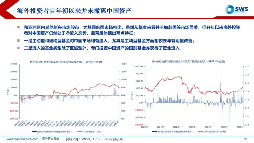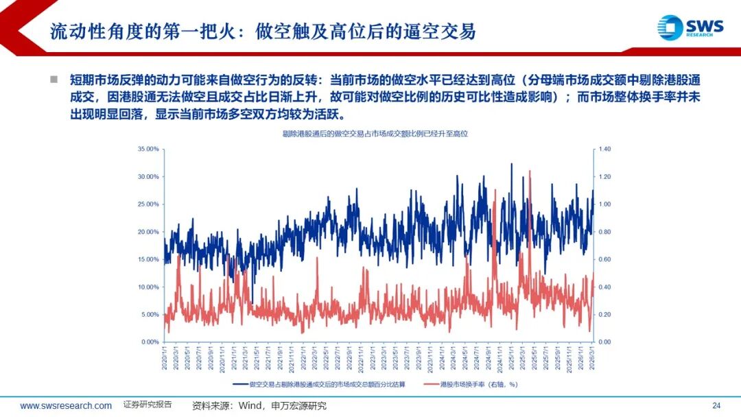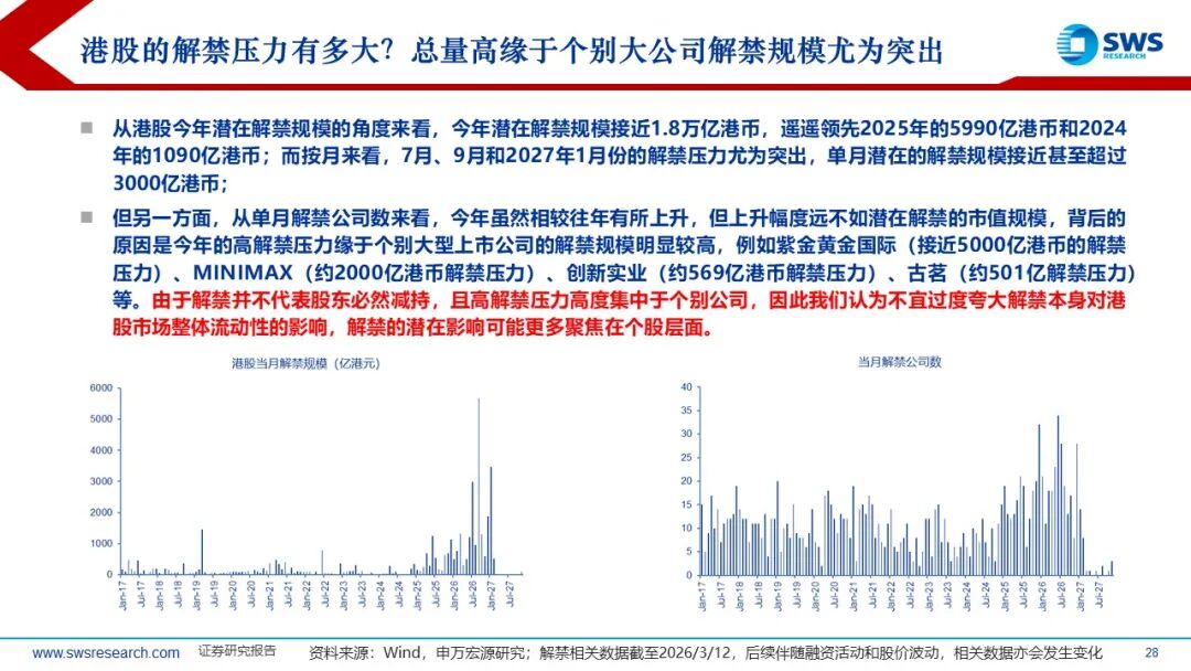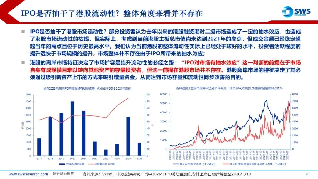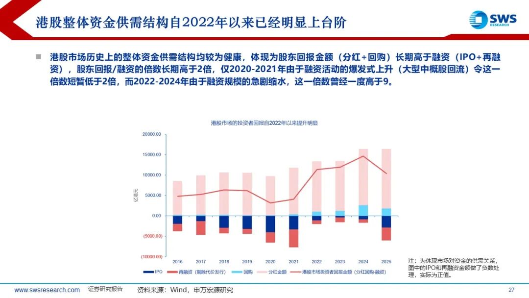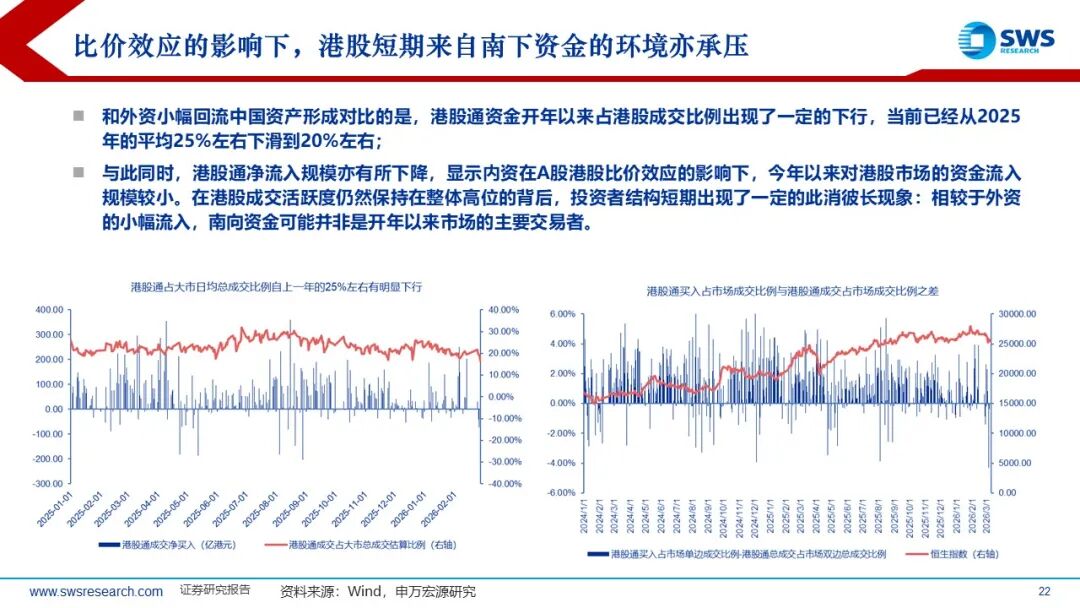 流动性分析:市场资金供需健康,但投资者结构有所变化,融资和解禁压力在一定程度上被高估。当前港股整体流动性处于较好水平,成交活跃度提升快于市场规模增长,但投资者结构年初以来有所变化。开年以来全球新兴市场明显跑赢发达市场,尤其是韩国和中国台湾市场成为主要驱动力。海外投资者对中国资产虽有流入但幅度相对温和,主要体现为主动型基金的改善。值得注意的是,在近期市场回调中,海外中国基金并未出现明显赎回潮,显示中国市场仍具有稳定性价值。但南向资金方面,受A股港股比价效应影响,南下资金开年以来的流入则有所承压。通过测算发现,近期港股通资金中可能以个人投资者(通过ETF)为主,而主动管理型公募等机构投资者或并非主要买入者。此外,近期市场做空比例触及高位,未来可能引发逼空反弹。部分投资者对港股今年融资和解禁压力较为关注,但我们认为去年以来的港股IPO潮并未抽干市场流动性,且考虑到港股的离岸市场属性,市场对新资产的扩容才是吸引增量资金的必经之路,且整体而言港股股东回报(分红+回购)长期高于融资规模(IPO+再融资),资金供需结构健康。解禁压力方面,虽然2026年解禁规模接近1.8万亿港币,但由于解禁压力高度集中于个别公司,对市场整体影响有限,主要聚焦个股 。