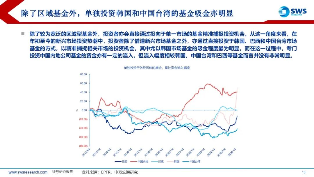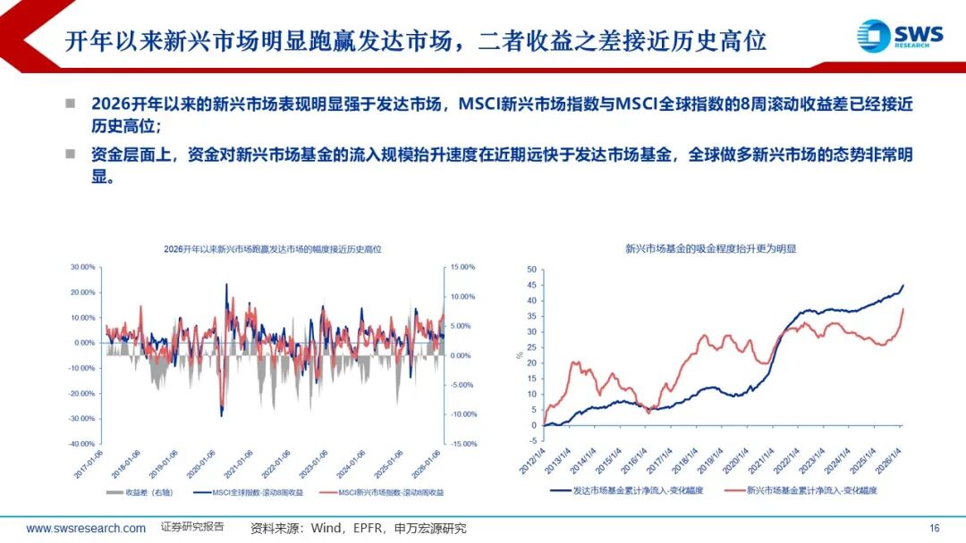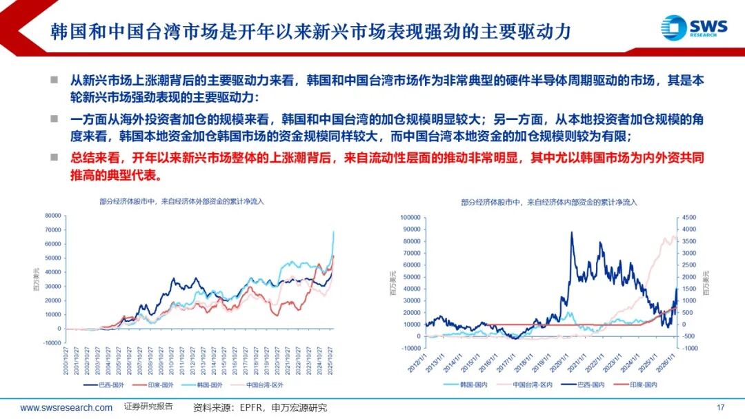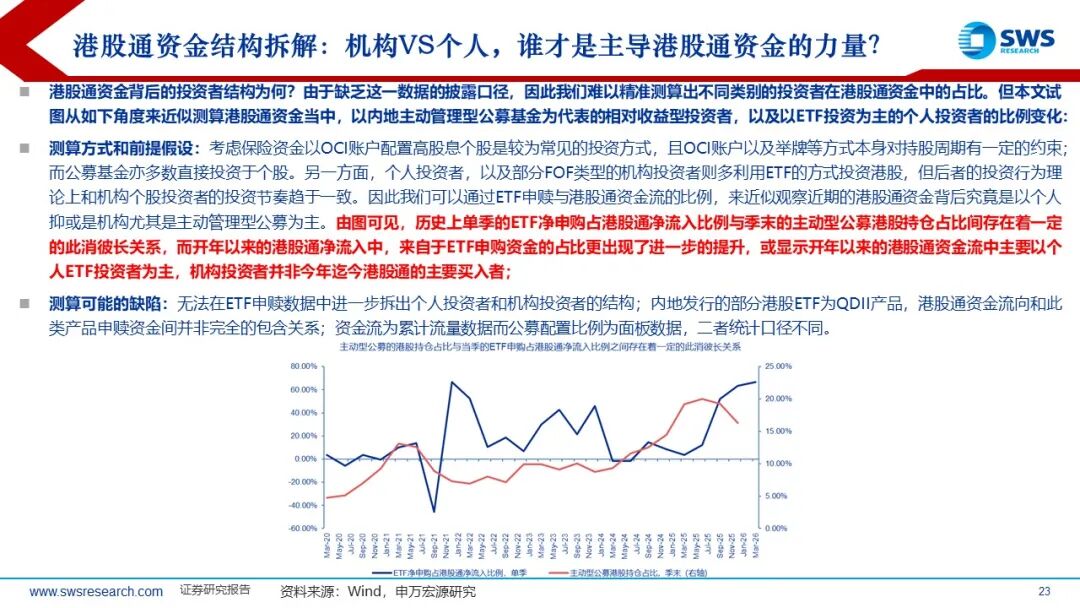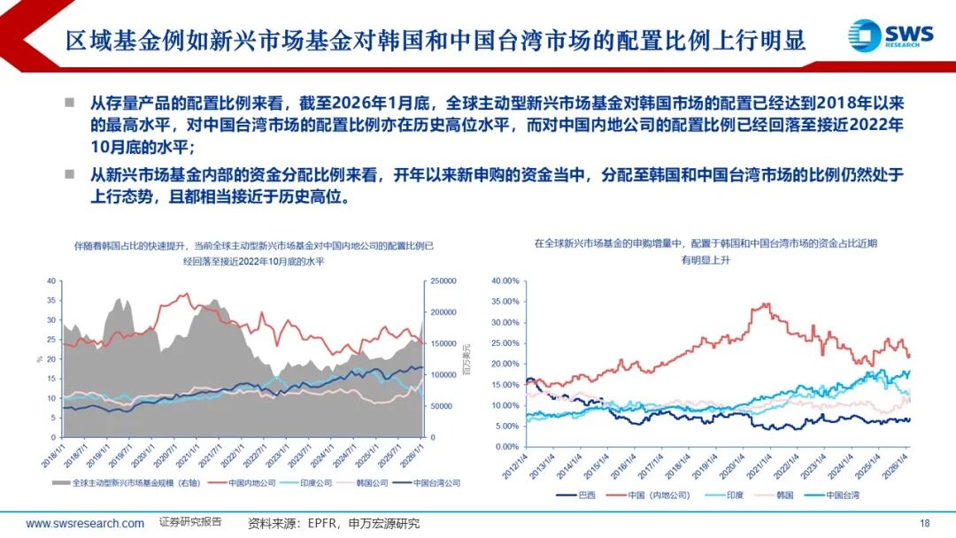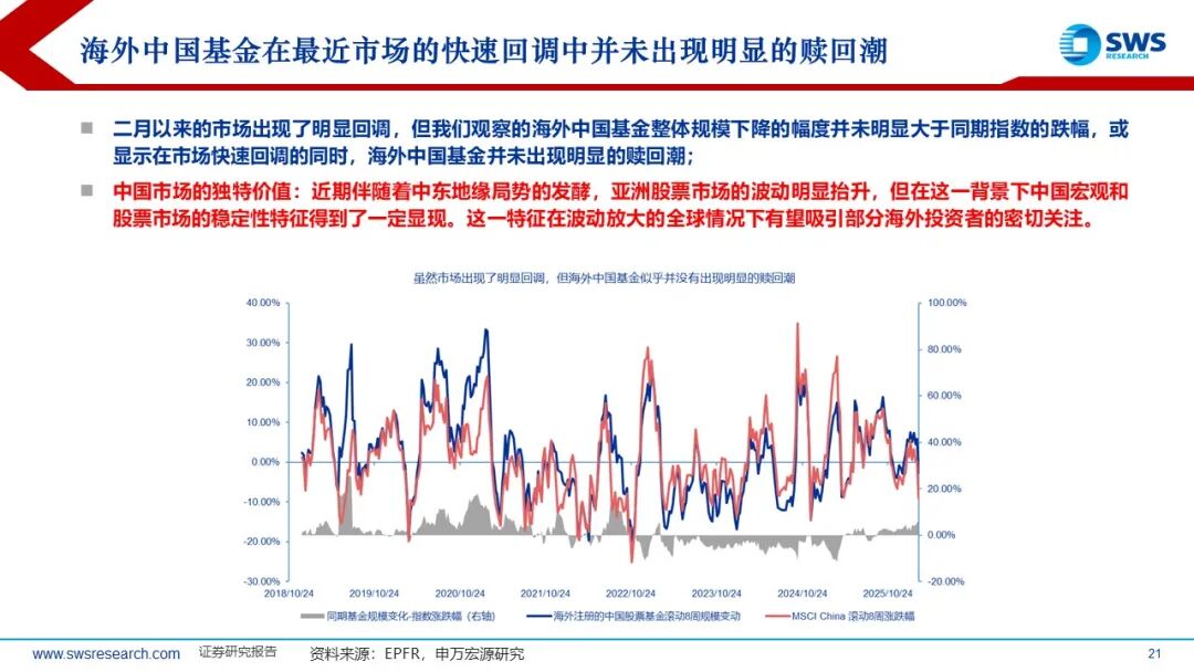 流动性分析:市场资金供需健康,但投资者结构有所变化,融资和解禁压力在一定程度上被高估。当前港股整体流动性处于较好水平,成交活跃度提升快于市场规模增长,但投资者结构年初以来有所变化。开年以来全球新兴市场明显跑赢发达市场,尤其是韩国和中国台湾市场成为主要驱动力。海外投资者对中国资产虽有流入但幅度相对温和,主要体现为主动型基金的改善。值得注意的是,在近期市场回调中,海外中国基金并未出现明显赎回潮,显示中国市场仍具有稳定性价值。但南向资金方面,受A股港股比价效应影响,南下资金开年以来的流入则有所承压。通过测算发现,近期港股通资金中可能以个人投资者(通过ETF)为主,而主动管理型公募等机构投资者或并非主要买入者。此外,近期市场做空比例触及高位,未来可能引发逼空反弹。部分投资者对港股今年融资和解禁压力较为关注,但我们认为去年以来的港股IPO潮并未抽干市场流动性,且考虑到港股的离岸市场属性,市场对新资产的扩容才是吸引增量资金的必经之路,且整体而言港股股东回报(分红+回购)长期高于融资规模(IPO+再融资),资金供需结构健康。解禁压力方面,虽然2026年解禁规模接近1.8万亿港币,但由于解禁压力高度集中于个别公司,对市场整体影响有限,主要聚焦个股 。