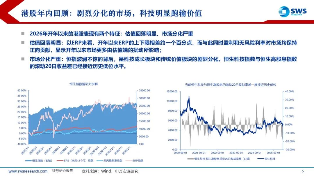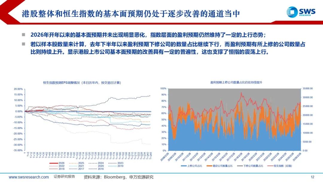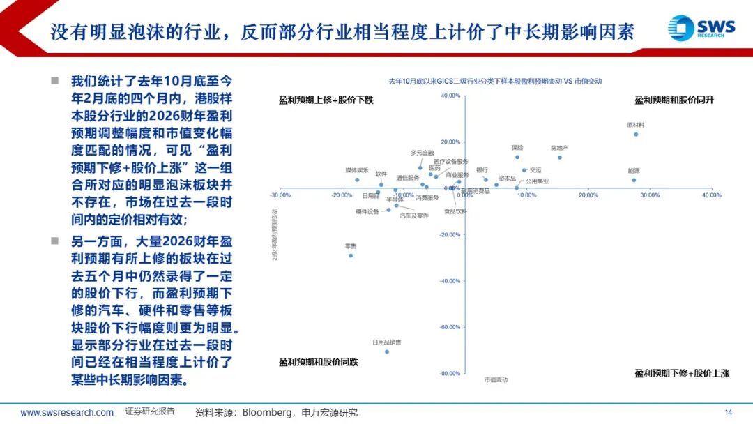 港股现状:板块强分化,估值已下探且定价充分。今年以来港股市场呈现出“估值回落明显”与“市场分化严重”两大特征:恒生指数表面波澜不惊,实则是科技成长板块明显跑输传统价值板块,两者收益差接近历史极值,因此单一估值指标已经难以概括这一变化,因此我们将市场拆分为传统经济(高股息属性)和新经济(科技成长)两部分进行观察。考虑到近年来港股高股息板块的主要投资者已经有所变化,我们将其的估值锚由美债收益率转为中债收益率,静态来看目前其股息率仍处于高位,对应股价仍具备上行潜力。相比之下,恒生科技指数受成分股利润不稳定和未来科技周期影响,估值逻辑则更为复杂,但不同考察时段和考察指标来看,当前科技板块整体的估值水平均处于历史均值下方。此外,美股的“HALO”交易蔓延至港股,市场正在定价AI时代对产业组织的冲击,导致部分科技龙头估值中枢下行,但对实现路径中的现实阻碍则认识不足,因此短期难免出现错杀。此外我们认为市场忽略了中美科技股的底层差异,即中国互联网多为O2O模式,拥有线下交付能力和实体门槛这些“重资产”,单纯的AI技术迭代难以轻易取代其核心壁垒。整体而言,今年港股整体仍具备基本面支撑,尽管估值受扰动,但港股整体盈利预期并未恶化。去年下半年以来,盈利预期上修的公司比例持续上升,显示基本面改善具有普遍性,支撑了指数的震荡态势。且分行业来看,自去年10月调整以来,港股如今几乎不存在有明显泡沫的行业。