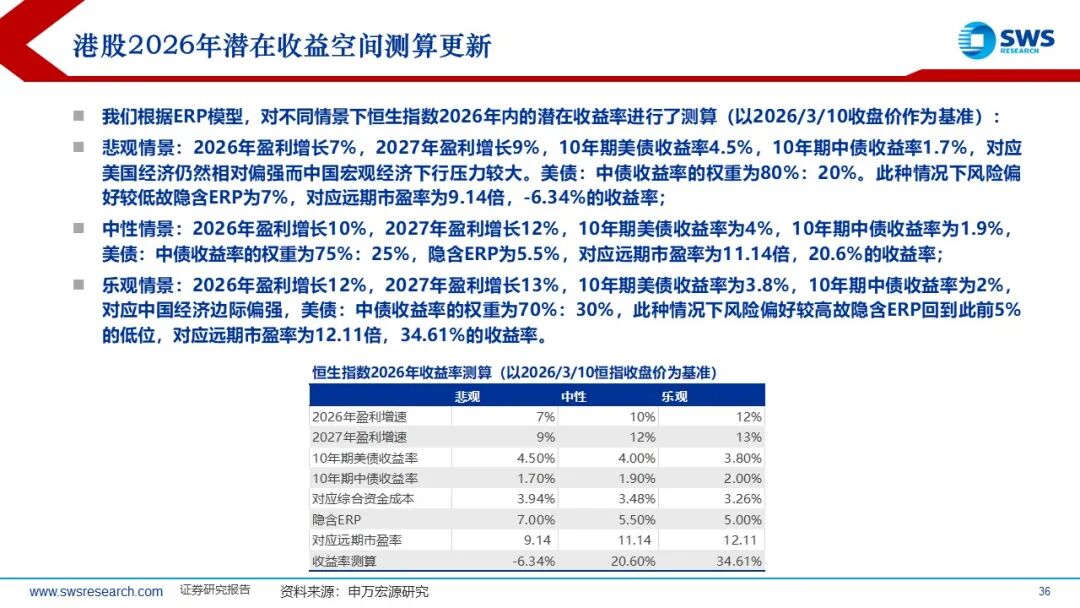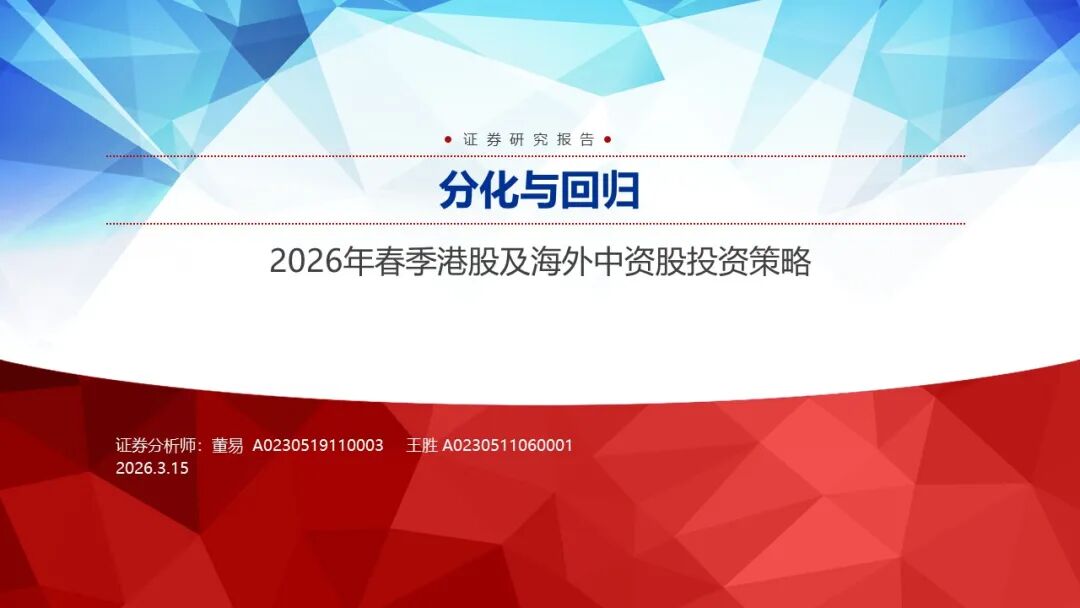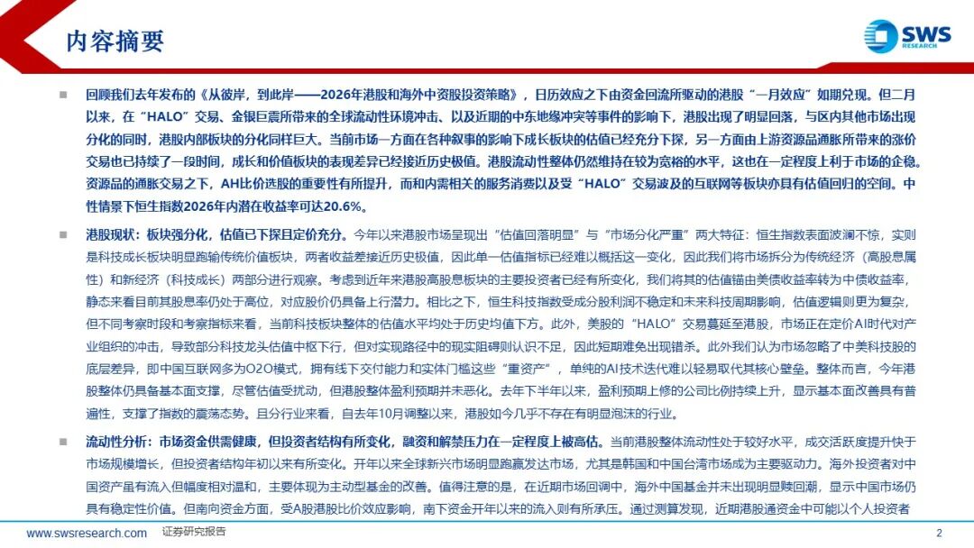 回顾我们去年发布的《从彼岸,到此岸——2026年港股和海外中资股投资策略》,日历效应之下由资金回流所驱动的港股“一月效应”如期兑现。但二月以来,在“HALO”交易、金银巨震所带来的全球流动性环境冲击、以及近期的中东地缘冲突等事件的影响下,港股出现了明显回落,与区内其他市场出现分化的同时,港股内部板块的分化同样巨大。当前市场一方面在各种叙事的影响下成长板块的估值已经充分下探,另一方面由上游资源品通胀所带来的涨价交易也已持续了一段时间,成长和价值板块的表现差异已经接近历史极值。港股流动性整体仍然维持在较为宽裕的水平,这也在一定程度上利于市场的企稳。资源品的通胀交易之下,AH比价选股的重要性有所提升,而和内需相关的服务消费以及受“HALO”交易波及的互联网等板块亦具有估值回归的空间。中性情景下恒生指数2026年内潜在收益率可达20.6%。