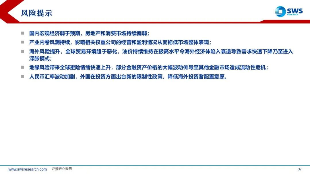 国内宏观经济弱于预期,房地产和消费市场持续偏弱;产业内卷风潮持续,影响相关权重公司的经营和盈利情况从而拖低市场整体表现;海外风险提升,全球贸易环境趋于恶化,油价持续维持在极高水平令海外经济体陷入衰退导致需求快速下降乃至进入滞胀模式;地缘风险带来全球避险情绪快速上升,部分金融资产价格的大幅波动传导至其他金融市场造成流动性危机;人民币汇率波动加剧,外国在投资方面出台新的限制性政策,降低海外投资者配置意愿。