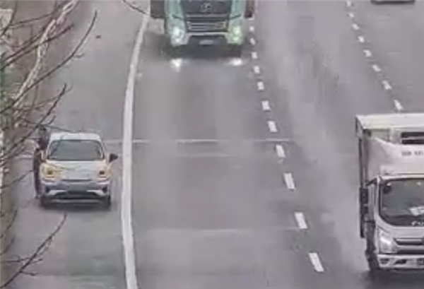 因为事发路段车流密集,高速大货车从旁边呼啸而过,稍有不慎就可能引起追尾、剐蹭等事故。