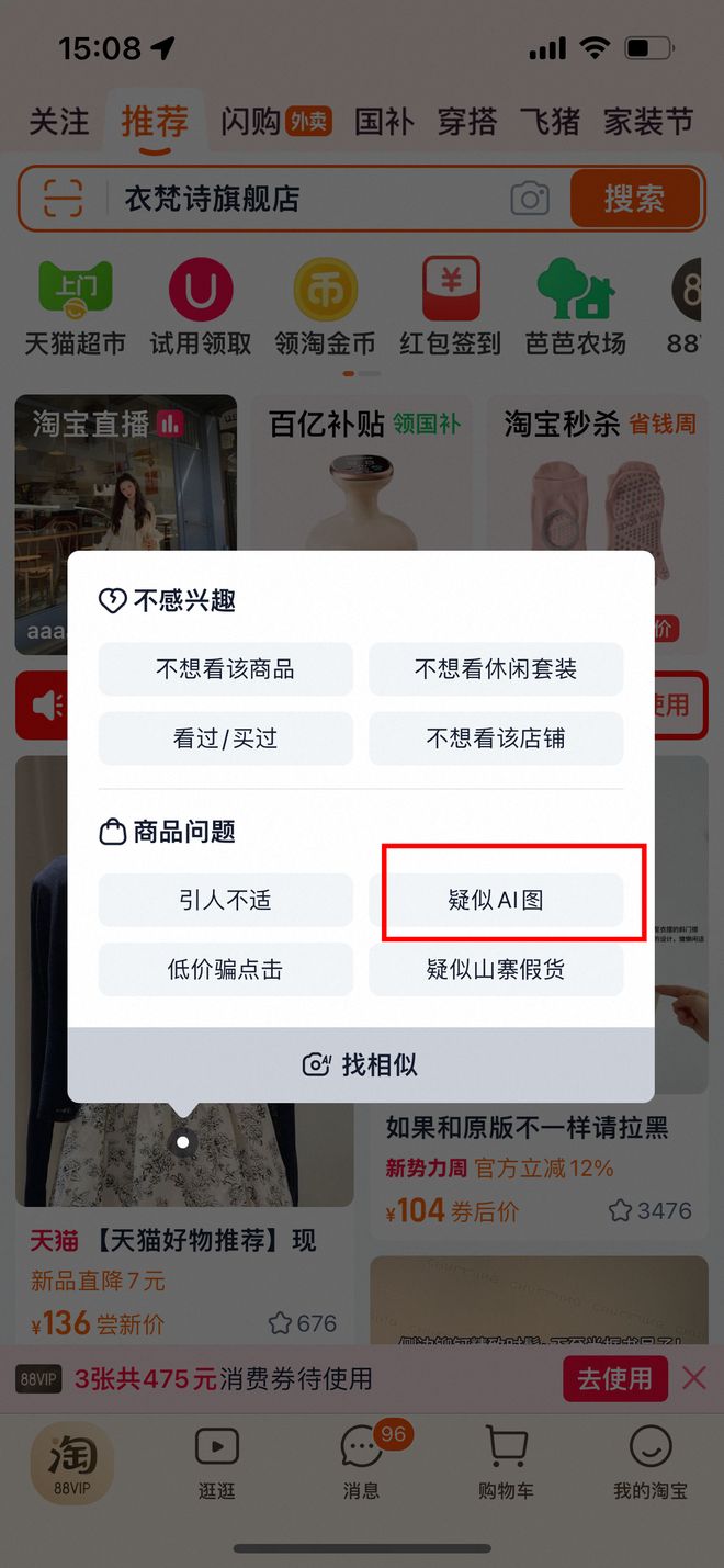 现在平台出现“疑似AI图”的商品问题反馈。记者截图
