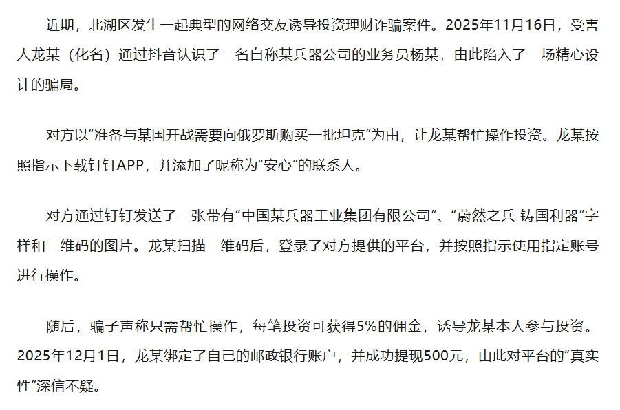 警方提醒:谨慎网络交友,任何涉及“军工”、“机密”的投资项目都极有可能是骗局。一旦发现被骗,立即保存聊天记录、转账凭证等证据,第一时间报警。
