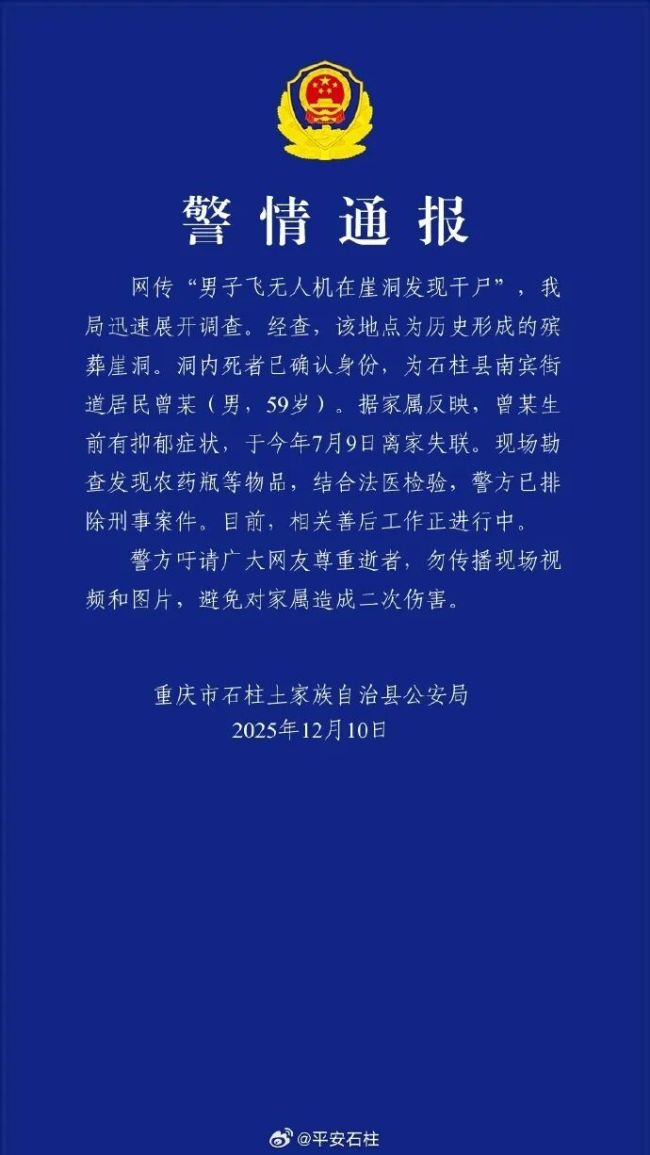 石柱土家族自治县公安局12月10日通报,网传“男子飞无人机在崖洞发现干尸”,该局迅速展开调查。经查,该地点为历史形成的殡葬崖洞。洞内死者已确认身份,为石柱县南宾街道居民曾某(男,59岁)。据家属反映,曾某生前有抑郁症状,于今年7月9日离家失联。现场勘查发现农药瓶等物品,结合法医检验,警方已排除刑事案件。目前,相关善后工作正进行中。