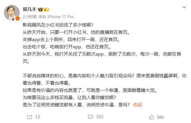 对此,同作为博主的“留几手”发出质疑:“不都说自媒体的初心,是靠内容和个人魅力吸引观众吗?原来是靠砸钱霸屏啊,你看也得看,不看也得看。”