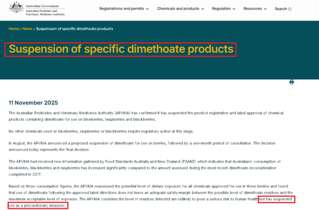 但澳洲农药与兽药管理局(APVMA)表示,目前关于二甲磷在浆果上使用的规定需要更严格,以确保食品安全。