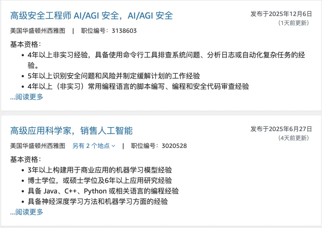 万人大裁员的同时,亚马逊还宣布对AWS投资500亿美元,用于扩建AI和基础设施。目前,在“亚马逊将在明年1月实行下一轮万人大裁员”的风声下,其官网依然挂出了机器学习顾问、AI应用科学家等多个AI相关职位。