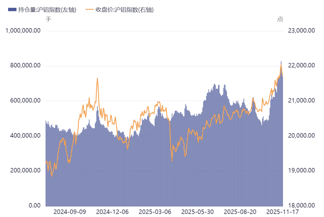 图片说明:沪铝收盘价与持仓量变化,数据来源于同花顺