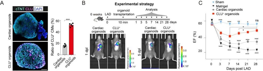 团队还构建了高表达CLU的工程化心脏类器官,将其移植到心梗小鼠体内后,类器官成功与宿主心脏融合,有效促进心肌增殖和心功能恢复。即便在成年心脏中,激活Clu基因也能实现心肌增殖增加、瘢痕减少的效果。