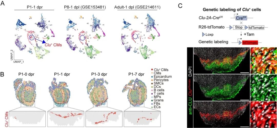 研究团队通过单细胞测序等技术,在新生小鼠受损心脏中发现了独特的Clu+心肌细胞——它们仅存于新生期损伤心脏,富集在伤口边缘,是专职修复细胞。
