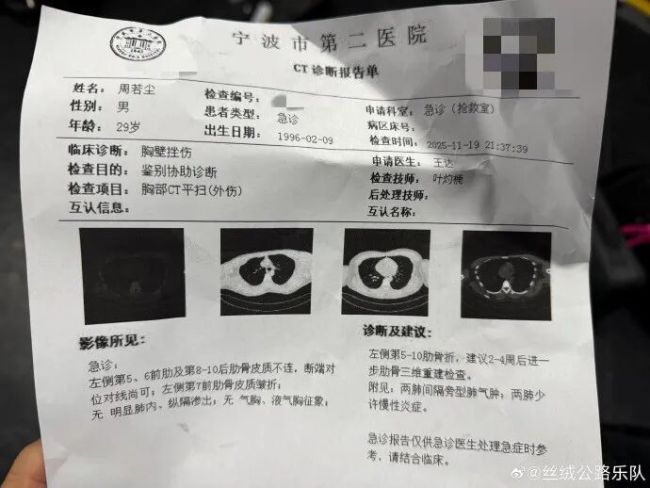11月19日晚,@丝绒公路乐队 发文:当晚演出时,我们的吉他手毛毛不小心从舞台上摔下,不得不中断演出。紧急送到医院拍片诊断后,发现肋骨断了六根。