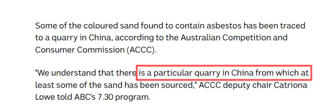 澳大利亚竞争与消费者委员会(ACCC)近日表示,近期在全澳范围内被检出含石棉的彩色沙子,其供应链已被追溯至中国的一家特定采石场。