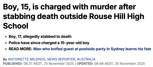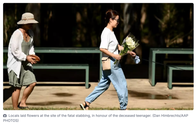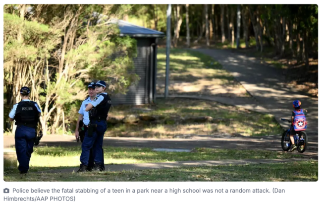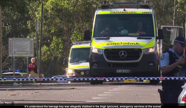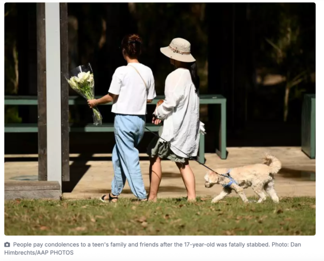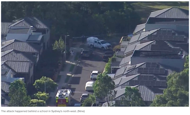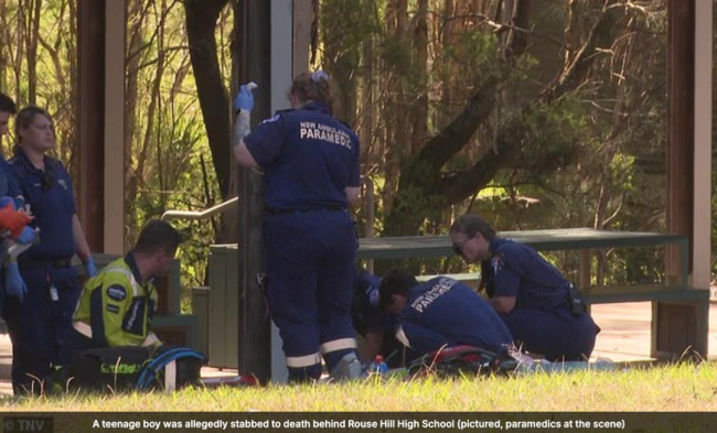 悉尼西北Rouse Hill High School学校后方的草地上,一名穿着校服的17岁男孩倒在血泊中,周围学生和路人都被吓到了,慌乱呼救...