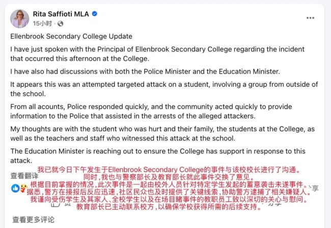 西澳副州长Rita Saffioti在事后发表声明,称她已与学校校长、警察部长及教育部长进行了沟通。