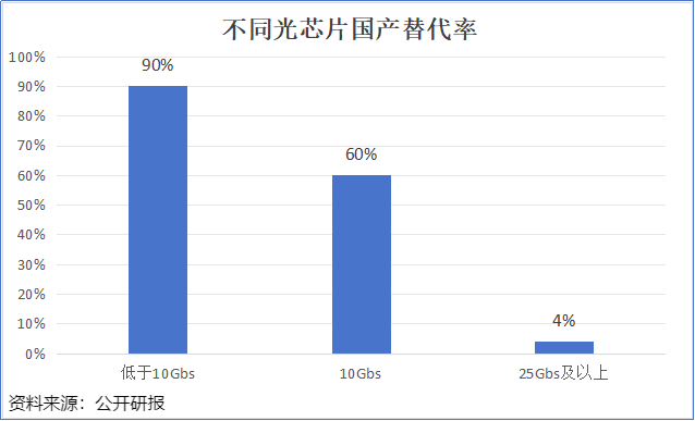 而25G及以上的高速光芯片,主要应用于高端移动通信和数据中心。这一市场长期被海外巨头主导。数据显示,我国25G光芯片的国产化率约为25%,而25G以上超高速光芯片的国产化率仅为4%。