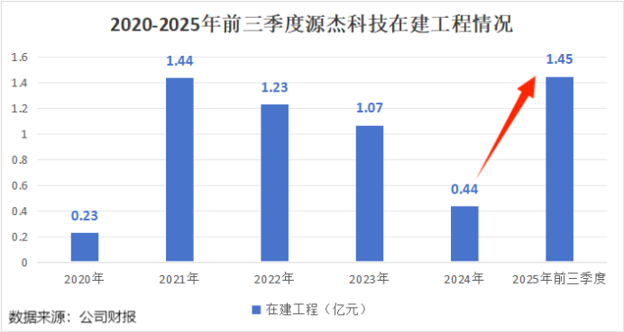 截至2025年三季度末,公司在建工程达到了1.45亿元,同比激增126.03%。