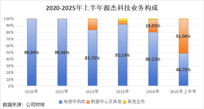 2025年上半年,源杰科技的数据中心及其他业务收入达到1.05亿元,同比激增1034.18%,占比超过50%,首次超过电信业务。