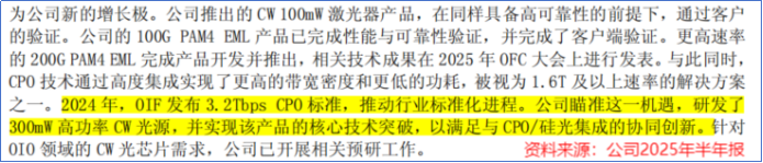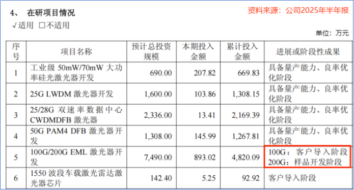 从公司2025年半年报披露的在研项目进度来看,其100G EML芯片正在客户端进行送样审核(导入阶段),而更高端的200G EML芯片也正处于样品研发阶段。