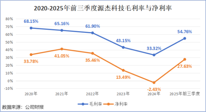 随着高毛利的数据中心产品占比上升,2025年前三季度,源杰科技的综合毛利率回升至54.76%。