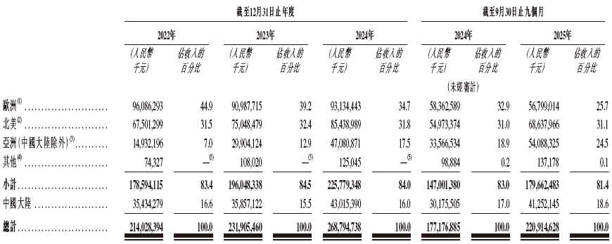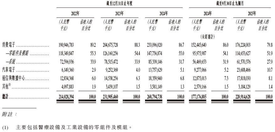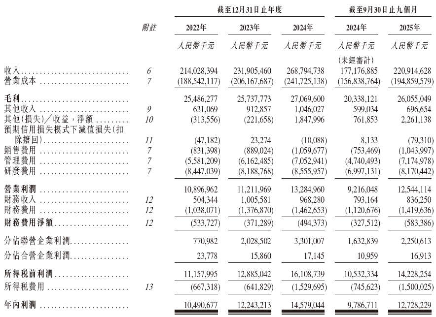 招股书显示,在过去的2022年、2023年、2024年和2025年前九个月,立讯精密的营业收入分别为人民币2,140.28亿、2,319.05亿、2,687.95亿和2209.15亿元,相应的净利润分别为人民币104.91亿、122.43亿、145.79亿和127.28亿元。