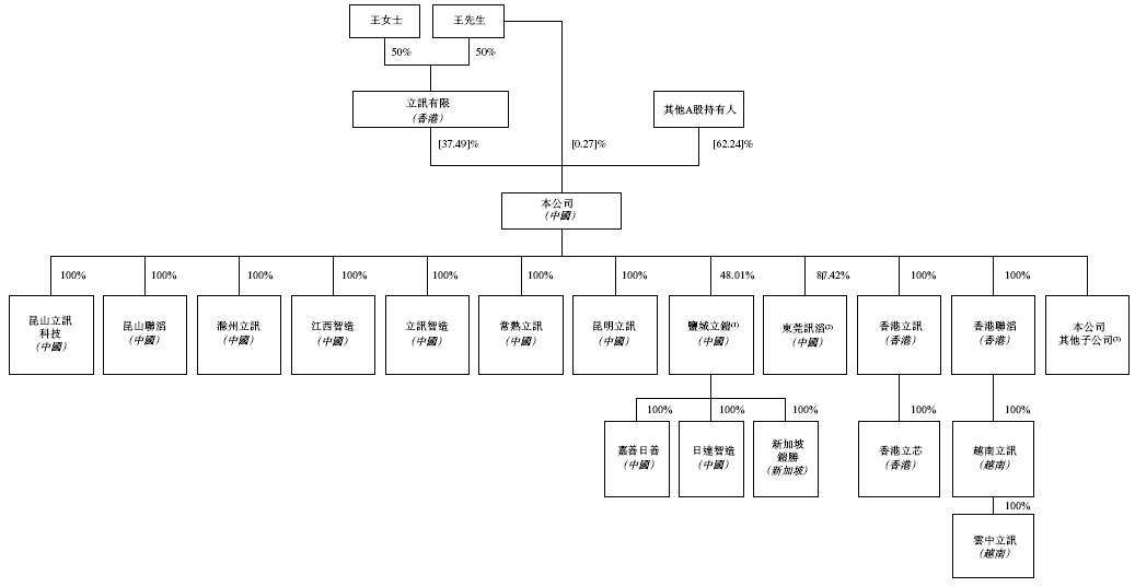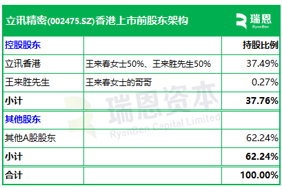 王来春女士、王来胜先生分别拥有50%、50%的立讯香港持股37.67%,王来春先生直接持股0.21%,合计持股约37.88%,为为控股股东。