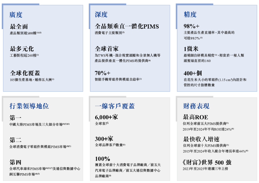 根据弗若斯特沙利文的资料,于2024年按收入计,立讯精密在精密智造解决方案(PIMS)行业中排名全球第四、中国大陆第一,并在消费电子、汽车电子、通信与数据中心等各主要业务线均处于全球领先地位;在全球精密智造解决方案提供商中,公司拥有最全面及最多元化的产品组合。
