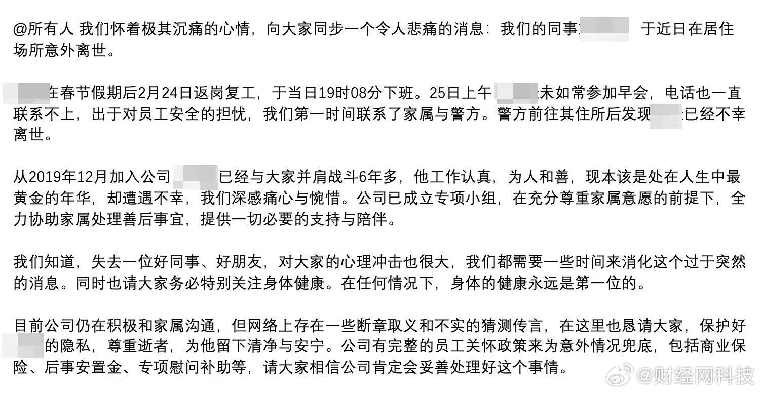 我们怀着极其沉痛的心情,向大家同步一个令人悲痛的消息:我们的同事**意外离世。**在春节假期后于2月24日返岗复工,当日19时08分下班。25日上午**未如常参加早会,电话也一直联系不上,出于对员工安全的担忧,我们第一时间联系了家属与警方。警方前往其住所后发现:已经不幸-离世。
