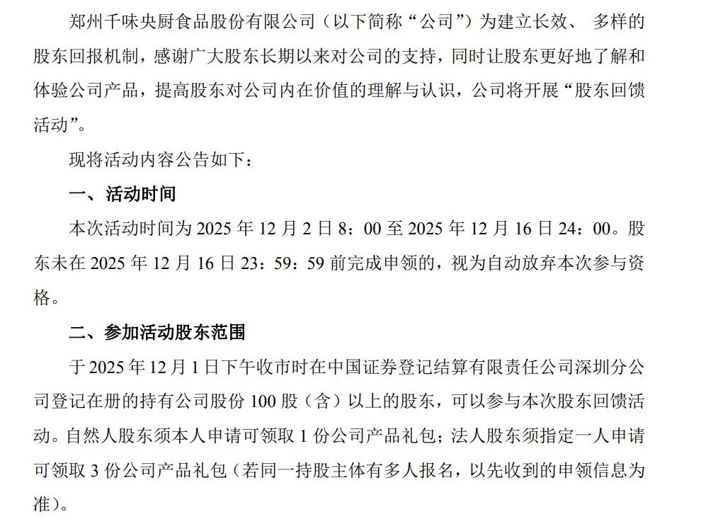 峨眉山之后,今天又有上市公司回馈股东。千味央厨发布公告,公司将开展“股东回馈活动”。公告显示,股东可以凭有效信息验证股东身份参与活动。公司将根据验证成功的股东,赠予价值200元公司产品礼包作为回馈,只不过持股要今天收盘才有。