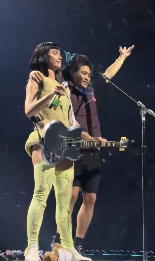 最近一次骚扰是今年6月份,他在水果姐悉尼演唱会上突然冲上台,搂住正在演唱的水果姐,水果姐翻了个白眼躲开了。