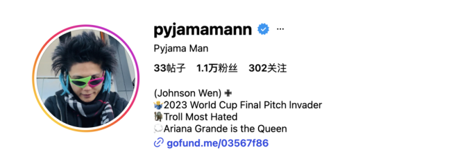 他在Instagram上的简介是“全网最遭恨的喷子”和“2023年世界杯决赛场地入侵者”。