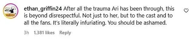 “在Ari经历了那么多创伤之后,这简直太不尊重人了。不仅是对她,也是对剧组和所有粉丝。这简直令人愤怒。你应该感到羞耻。”