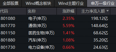 资金面上,主力资金大举涌入双创方向!截至发稿,电子、通信、医药生物、电力设备板块分别获主力资金净流入198亿元、148亿元、68亿元、24亿元,跻身31个申万一级行业TOP5!