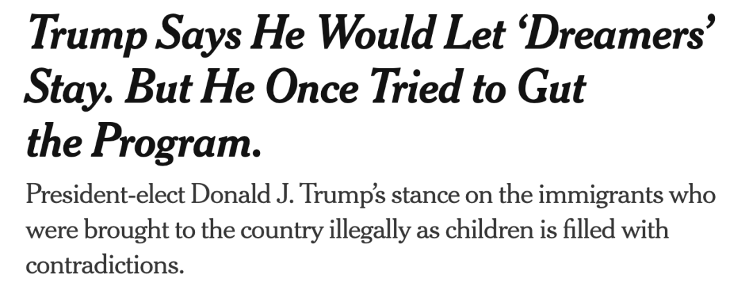 川普在采访中表示:“他们应该感到安全,但我希望能为他们做点什么。”随后又补充称,“一年后再给出答案”。这一表态与其第一任期内推动废除DACA计划的立场形成鲜明反差。