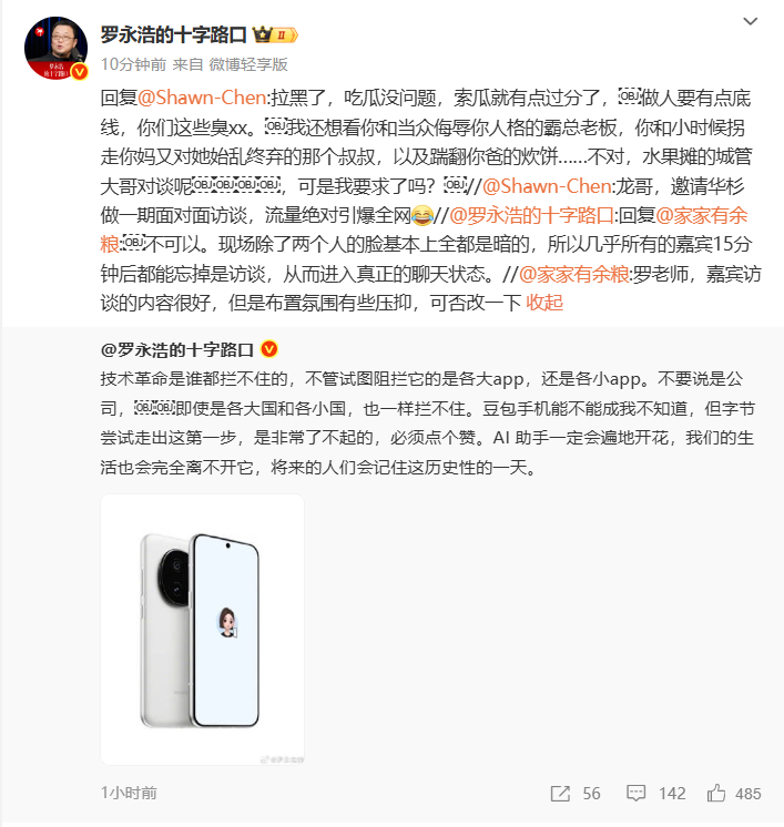网友建议邀请华杉访谈 罗永浩将其拉黑:做人要有点儿底线 Source 今日,有网友给罗永浩留言:“龙哥(罗永浩),邀请华杉做一期面对面访谈,流量绝对引爆全网。”对此,罗永浩回应称:“拉黑了,吃瓜没问题,索瓜就有点过分了,做人要有点底线。” 随后,罗永浩还对该网友进行了“痛骂”,如截图所示: 近日,罗永浩与华杉再次在网上互呛,引发网友热议。 11月25日,华杉发文称:“西贝是中国餐饮业的天花板,无论对顾客还是对员工,都是诚心诚意做到极致。被诱入黑白颠倒的网络罗刹国,被人算计。西贝坚持自己的华夏子弟精神,不苟且偷生,凭仁义立世。” 11月26日凌晨,罗永浩转发华杉的上述微博内容并表示,抛出三连质问:“谁诱的?谁算计了?你想干什么?你要是说不清楚,我就公布录音了。”