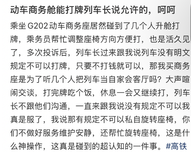 据网友描述,那几名乘客不仅长时间打牌喧闹,还在车厢内用餐、反复喧哗,更有工作人员帮忙调整座椅方向以方便其打牌,这一做法让投诉旅客难以接受。