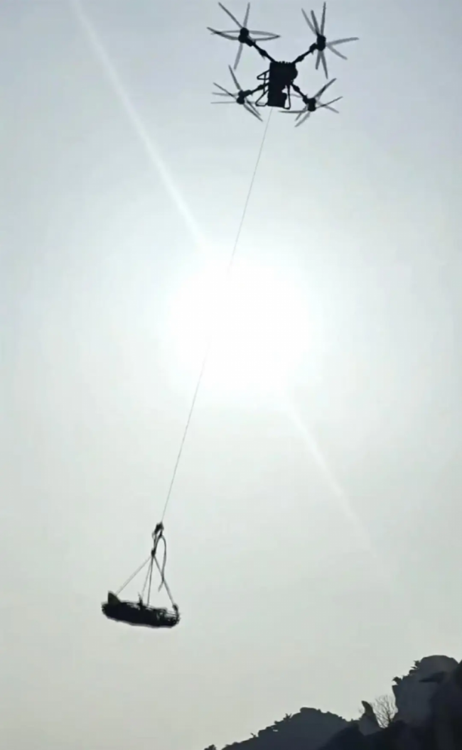 博主“在登山时不幸意外坠崖身亡”引发关注。相关视频显示,一架无人机吊着担架在空中缓慢升起,该视频关联“山地搜救演练”词条。在视频评论区,视频发布者称“确认人已经走了,而后才申请并征得同意才用的无人机吊运。”