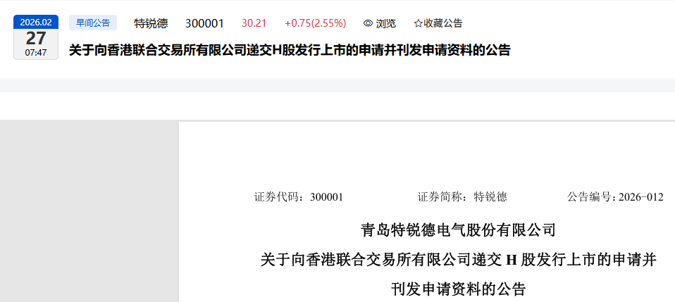 青岛特锐德电气股份有限公司(以下简称“公司”)已于2026年2月26日向香港联合交易所有限公司(以下简称“香港联交所”)递交了发行境外上市外资股(H股)股票并在香港联交所主板挂牌上市(以下简称“本次发行上市”)的申请,并于同日在香港联交所网站刊登了本次发行上市的申请资料。本次发行上市的相关申请资料为公司按照香港证券及期货事务监察委员会(以下简称“香港证监会”)及香港联交所的要求编制和刊发,为草拟版本,其所载资料可能会适时作出更新及修订。