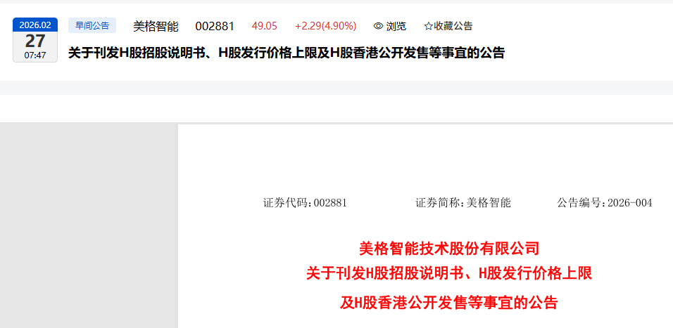 公司本次H股发行的价格最高不超过每股28.86港元,公司H股香港公开发售于2026年2月27日开始,预计于2026年3月5日结束,并预计于2026年3月9日前(含当日)公布发行价格,相关情况将刊登于香港联交所网站(www.hkexnews.hk)和公司网站(www.meigsmart.com)。