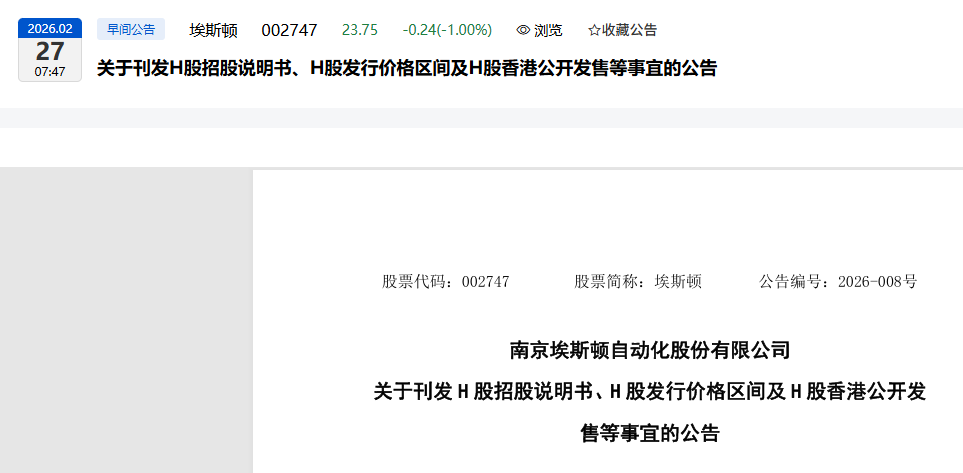 公司本次H股发行的价格区间初步确定为15.36港元至17.00港元。公司H股香港公开发售于2026年2月27日开始,预计于2026年3月4日结束,并预计于2026年3月6日前(含当日)公布发行价格,相关情况将刊登于香港联交所网站(www.hkexnews.hk)和公司网站(www.estun.com)。
