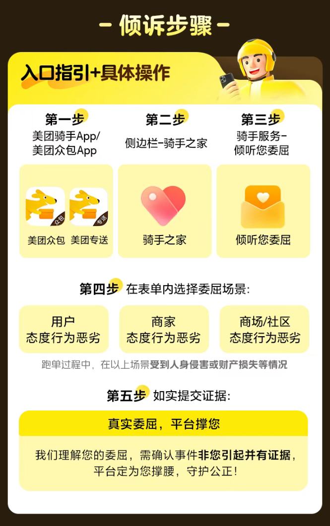 美团宣布骑手委屈关怀计划正式发布:最高5万元委屈安抚金 Source 今日,美团宣布,美团骑手委屈关怀计划正式发布,美团将给骑手提供最高5万元委屈安抚金。为什么要做委屈关怀?美团表示,配送路上难免经历委屈时刻,骑手的每份付出都值得被守护,每次送达都该有善意回响。 据介绍,一经核实属“非骑手责任”的委屈事件,审核通过后,美团将提供最高5万元的委屈安抚金,外加平台法律援助。 据了解,骑手可在美团骑手App或美团众包App提交证据,可选择用户、商家或商场/社区态度行为恶劣委屈场景(在跑单过程中,在以上场景受到人身侵害或财产损失等情况。) 美团称,确认事件非骑手引起并有证据时,平台将为骑手撑腰。 目前,美团骑手委屈关怀计划正逐步覆盖全国中。
